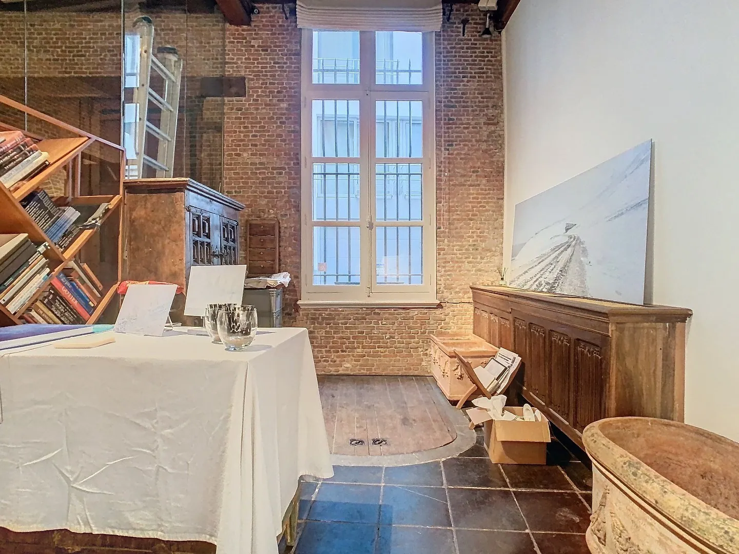 Bij het binnenkomen word je meteen ondergedompeld in de warme, karaktervolle sfeer van het gebouw. De ruimte ligt in een levendige voetgangerszone, omringd door historische gevels, gezellige straten en de typische Antwerpse dynamiek.