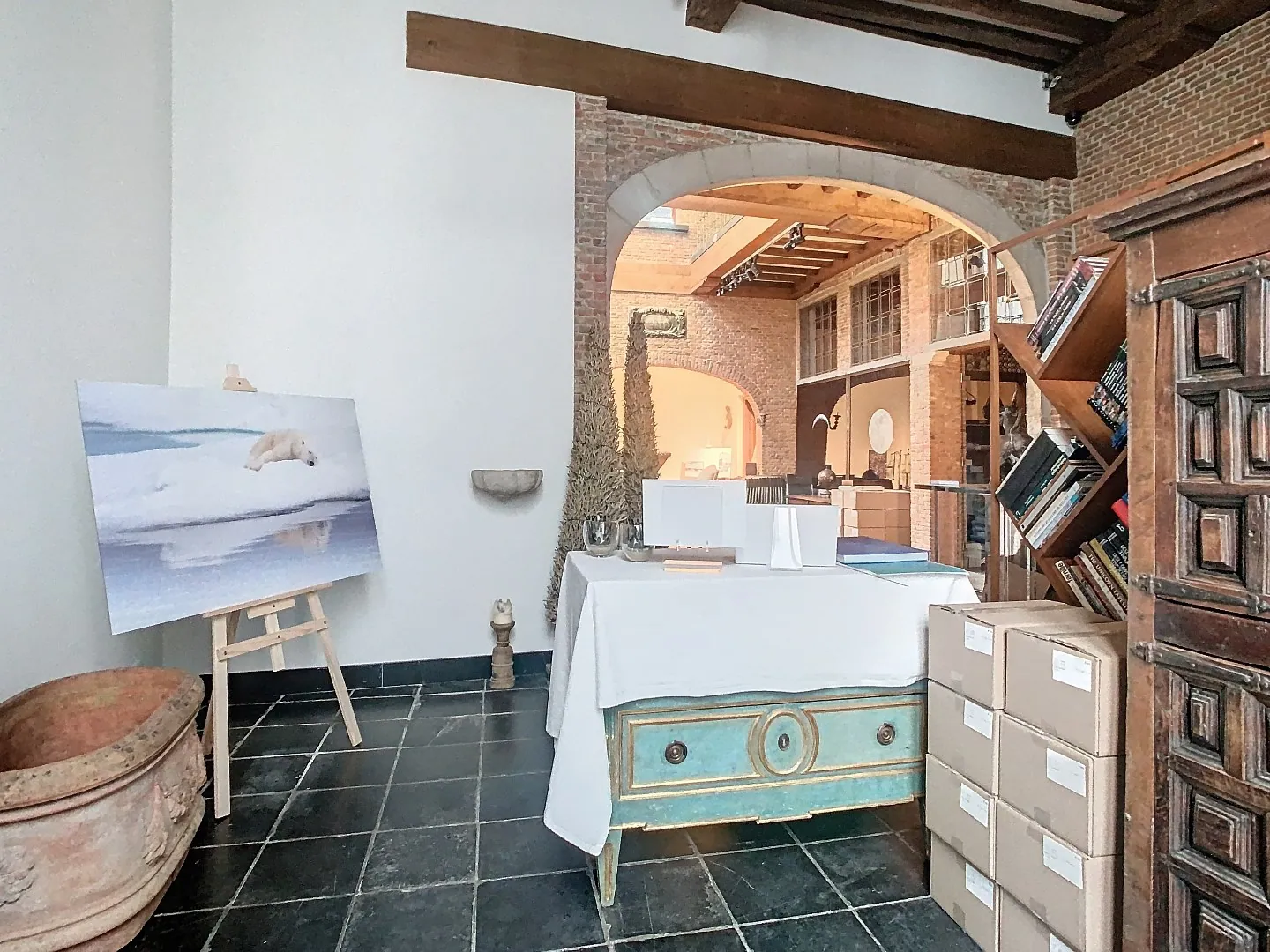 Bij het binnenkomen word je meteen ondergedompeld in de warme, karaktervolle sfeer van het gebouw. De ruimte ligt in een levendige voetgangerszone, omringd door historische gevels, gezellige straten en de typische Antwerpse dynamiek.