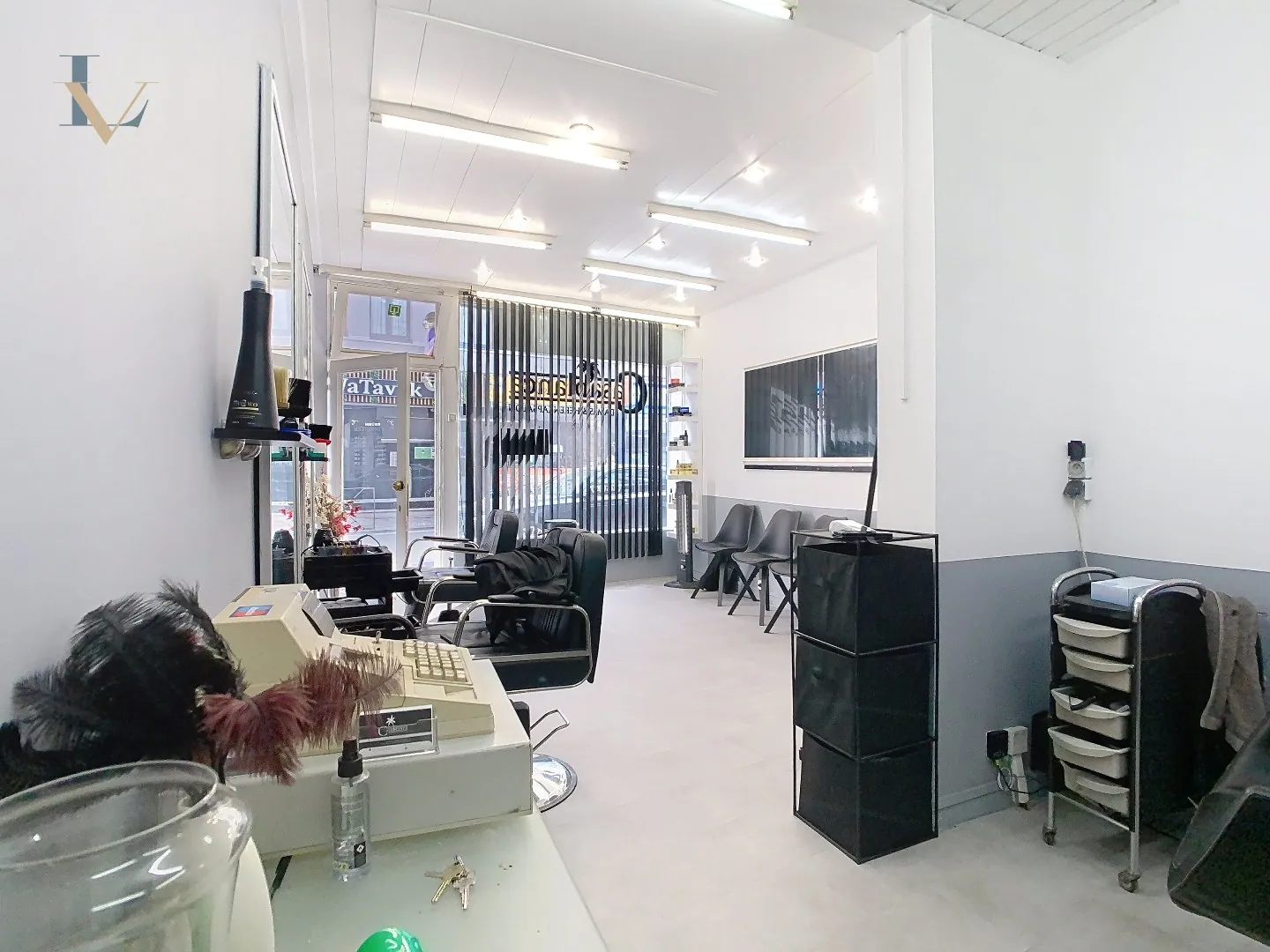 Het handelsgelijkvloers is ingericht als kapperszaak en beschikt over een achterliggend woongedeelte met keuken.