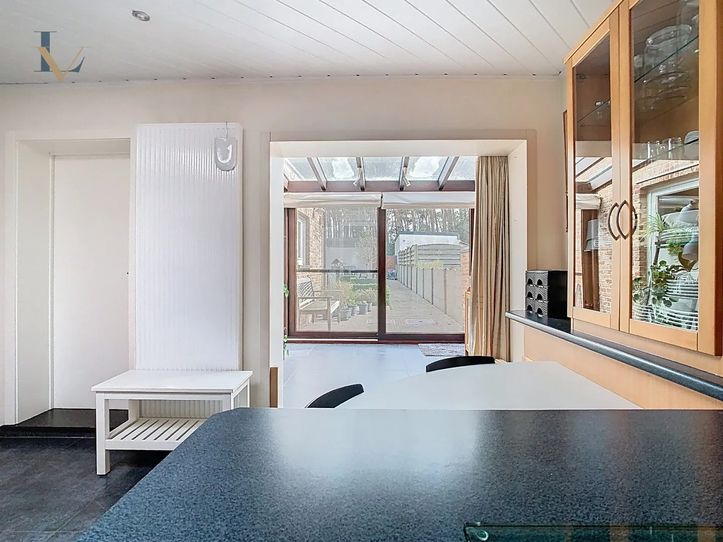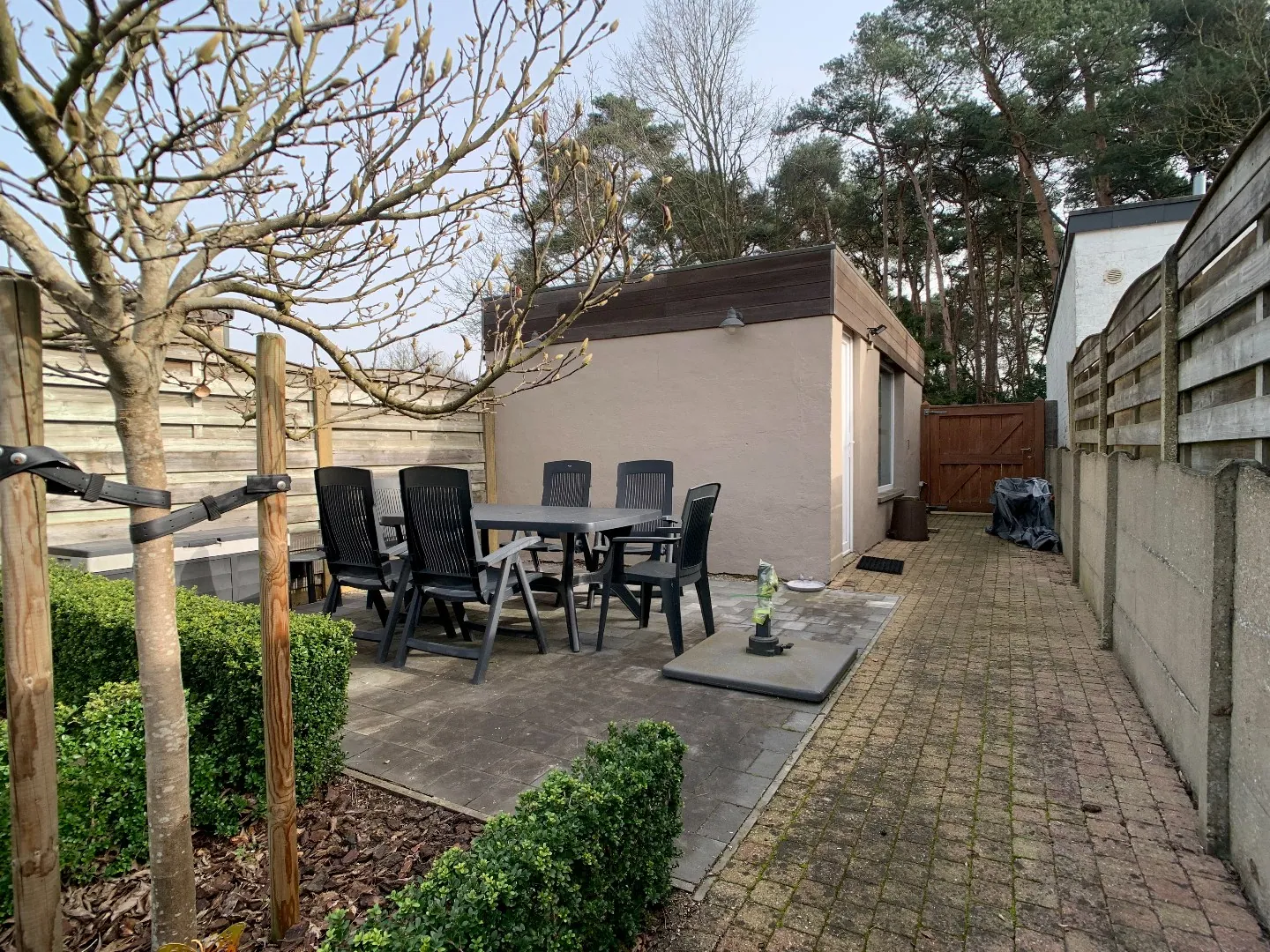 Via de zonnige veranda heeft u toegang tot de tuin met aangenaam zonneterras. Achteraan de tuin bevindt zich een ruime vrijstaande garage en een achteringang via een servitudeweg die uitgeeft op een bos, ideaal voor wie houdt van rust en natuur.