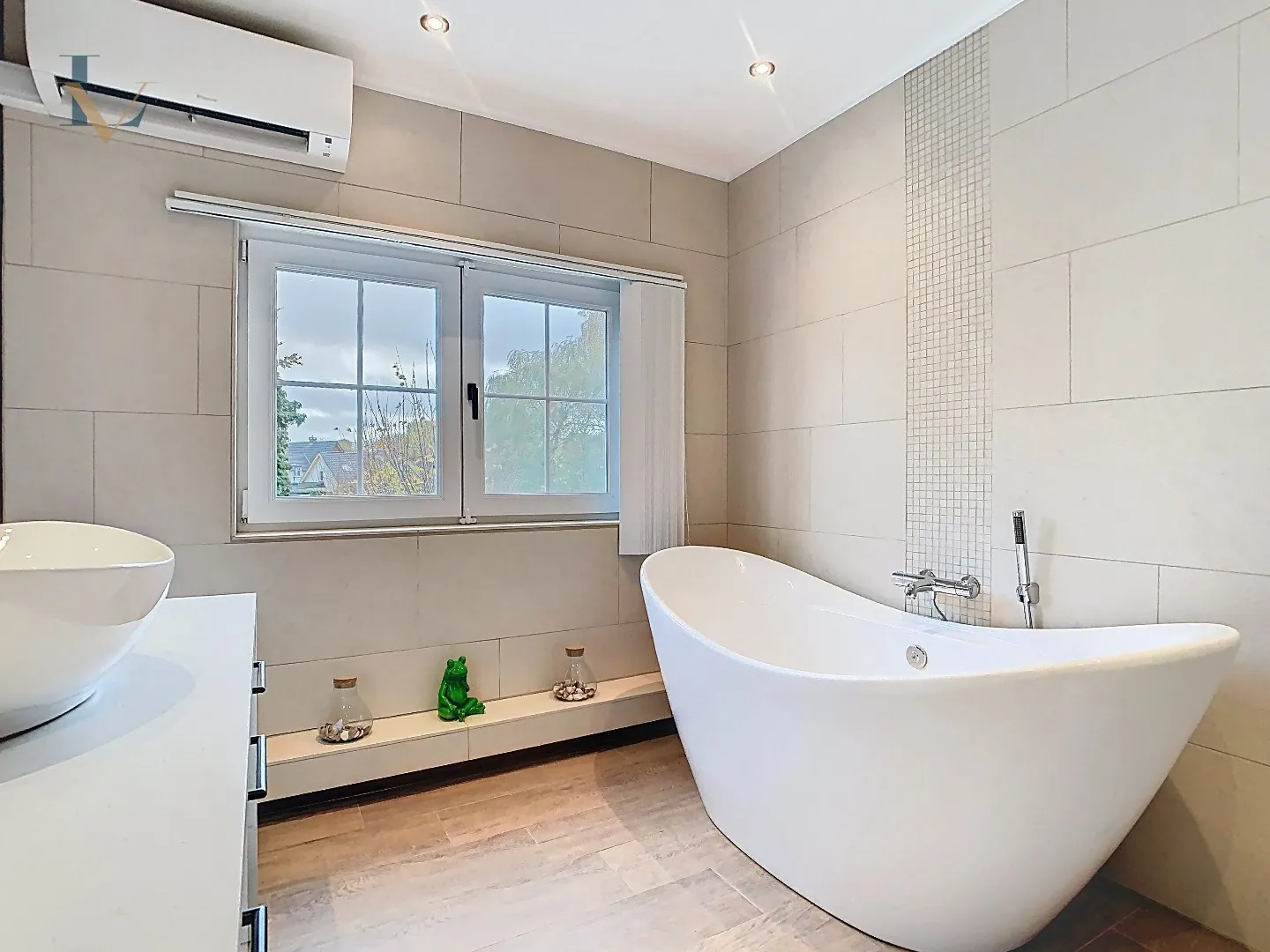 De luxueuze badkamer is stijlvol ingericht met een inloopdouche, een elegant vrijstaand bad en een moderne lavabo.