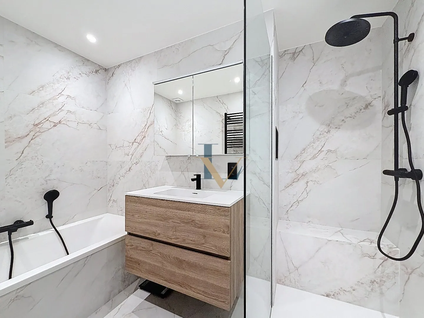 Op de eerste verdieping bevinden zich twee slaapkamers: één ruime master bedroom en een tweede, iets kleinere maar comfortabele kamer. De stijlvolle badkamer is afgewerkt met kwaliteitsvolle materialen en beschikt over een bad, douche en lavabo-meubel. Hier bevindt zich ook een apart toilet.